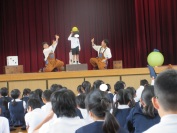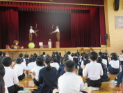 芸術鑑賞会に2人組パフォーマンスユニット「おんぷらんと」さんが来てくださいました。 パントマイムやジャグリングなどの大道芸を音楽に合わせて披露してくださいました。 体育館に子どもたちの笑顔と驚きがあふれる1時間となりました。