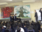 総社市在住の洋画家、待鳥一成さんが、絵画を2点阿曽小学校に寄贈してくださいました。