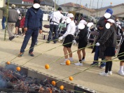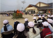 3・4年生が地域のとんどまつりに参加しました。 正月飾りやかきぞめなどをとんどの火で燃やし、炎が高く上がる様子を見守りました。 竹竿にはさんだミカンを煙であぶり、無病息災を願いながら食べました。 また、地域の方が作ってくださったぜんざいをいただきました。
